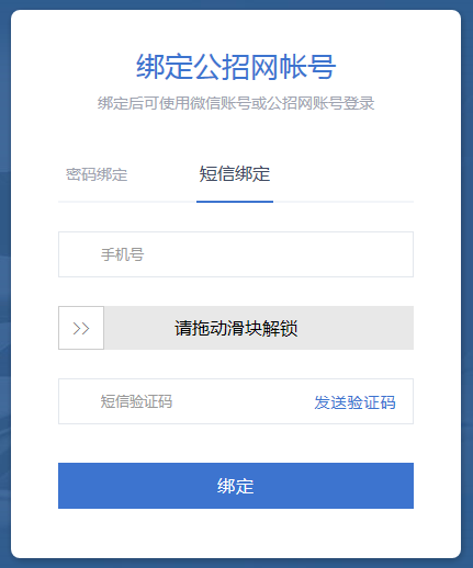 b) 短信绑定:输入手机号和验证码,点击"绑定"按钮。如果您已经用这个手机号注册过公招网,那么即可直接完成微信绑定并登录。